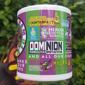 This drinking vessel features the logos of housing market acceleration agents Herod Eviction Services, early 90s theme restaurant chain Bovine Spongiform Burger, automation & robotics research laboratory Futurecom Europe, hedgehog-pulverising sports fabric manufacturer Sportivo, sporting data crunchers Statistika, bean-mashing health food specialists U-EAT Champion Legumes & their new owner DOMINION, rubber-coverings-for-wheels emporium Streatham Tyres, estate agents Ahrsoll & Jenkins and craft beer specialists Equity Brewery's Haemorrhoid Pilsner & Nightmarish Counterfactual English Pale Ale offerings.